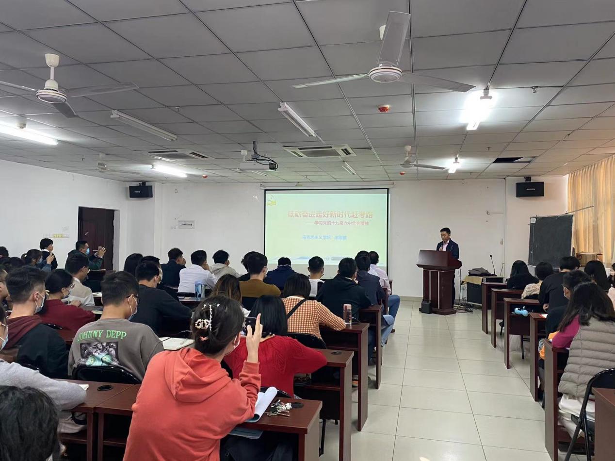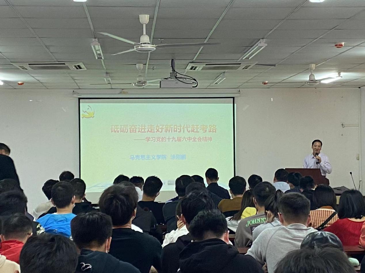 为深入学习贯彻党的十九届六中全会精神、全力以赴做好学习宣传工作,2021年11月24日下午,海南大学化学工程与技术学院特邀请马克思主义学院教授涂刚鹏作党的十九届六中全会精神专题报告,学院全体师生党员出席,学院党委副书记王林桂主持会议。